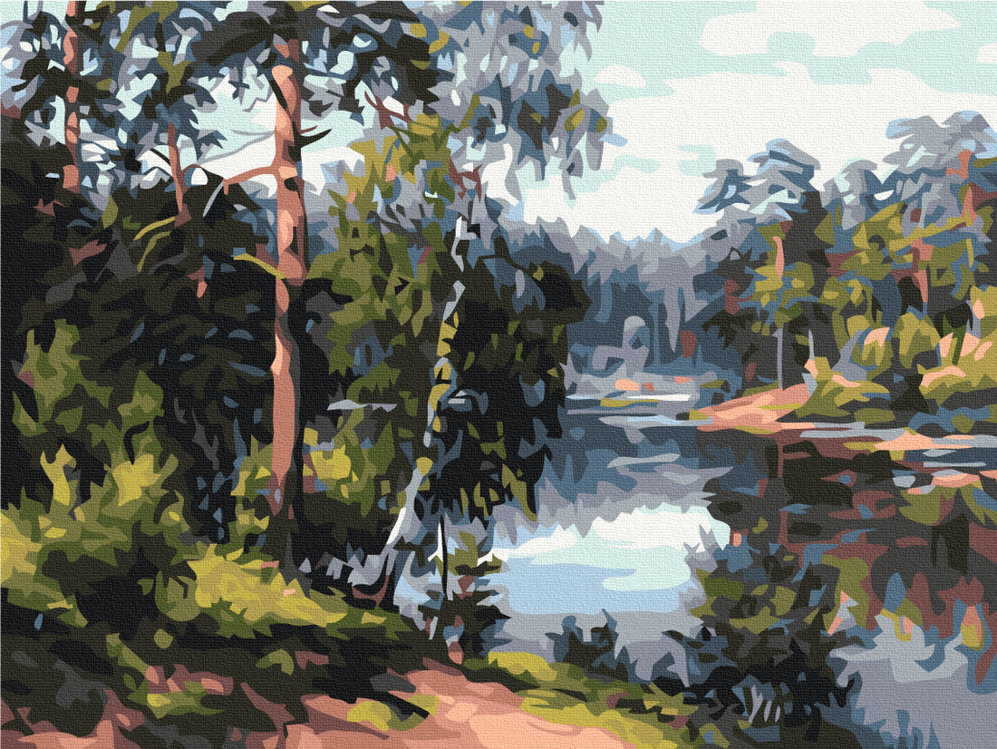 Immerse yourself in a tranquil scene with Lake in the Forest diamond painting. Create a...